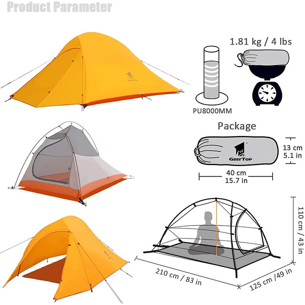 La tienda de campaña Libra para 2 personas pesa solo alrededor de 4 libras; Todos los accesorios de la tienda se pueden empacar en un tamaño compacto con una bolsa de transporte; Sería un equipo perfecto para actividades al aire libre para que 2 hombres o parejas disfruten de un viaje minimalista.